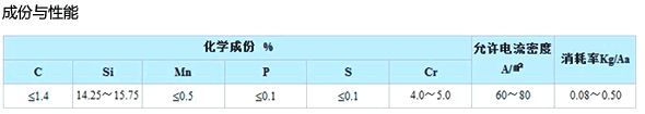 ① 产品介绍 高硅铸铁阳极是外加电流阴极保护系统理想的辅助阳极。广泛用于石油、天然气、化工厂、自来水公司等地下或水中金属构筑物的保护与防腐蚀。 ② 化学成份 ③ 常用规格型号 ④ 相关图片